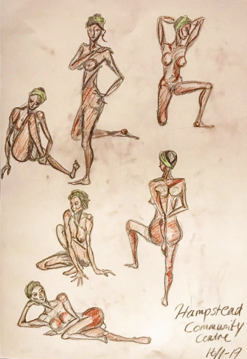 Wednesday’s Highlight: Life Drawing at the Hampstead Community Centre, a weekly affair, 7-9pm. A thoroughly enjoyable evening! All of the different approaches! I noticed that I tend to start out with the broader outline because I worry about getting the proportions right, and once I’ve got the loose imprint of the body (as I see it) and its planes and curves, I relax more and start thinking about details and shadings, while others immediately dedicated an entire A2 sheet to one single curve of a limb or minute lines and circles of an eye. It was so much fun, so deeply satisfying and enjoyable to immerse myself in. Surrounded by local regulars, men and women of all ages, some shy and quiet and others more talkative and willing to show (off) their work. Someone noted that my sketches were quite stylised – and it occurred to me how a lot of people’s works were, some exaggeratedly curvy, some super simplistic or abstract even, with an older or younger expression and emphasis – and how it’s an art to either perfect your own ‘style’ or aspire to let go of the comfort and restrictions of this habit and rather try to ‘sketch the body as it is’ – and then the fact that everyone was literally seeing it from different angles as well! To which other aspects of life might you apply all of this, haha? Very fascinating!